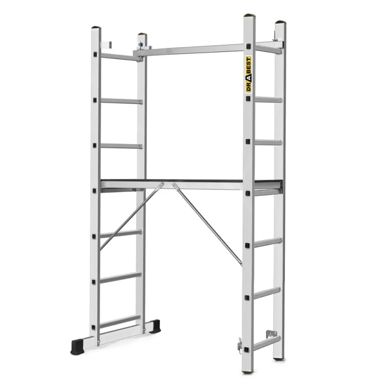 Konstrukcija od tri spojena elementa (2 x aluminijske ljestve i aluminijska platforma) za postavljanje u četiri različite konfiguracije. Odličan alat za kućnu, ali i profesionalnu upotrebu. Vrlo se jednostavno montira i lagana je za transport i skladištenje. Idealna je za sve poslove koji uključuju dugotrajno stajanje na ljestvama. Platforma je osigurana od klizanja gumom, a posebni potpornji sprječavaju njeno propadanje.