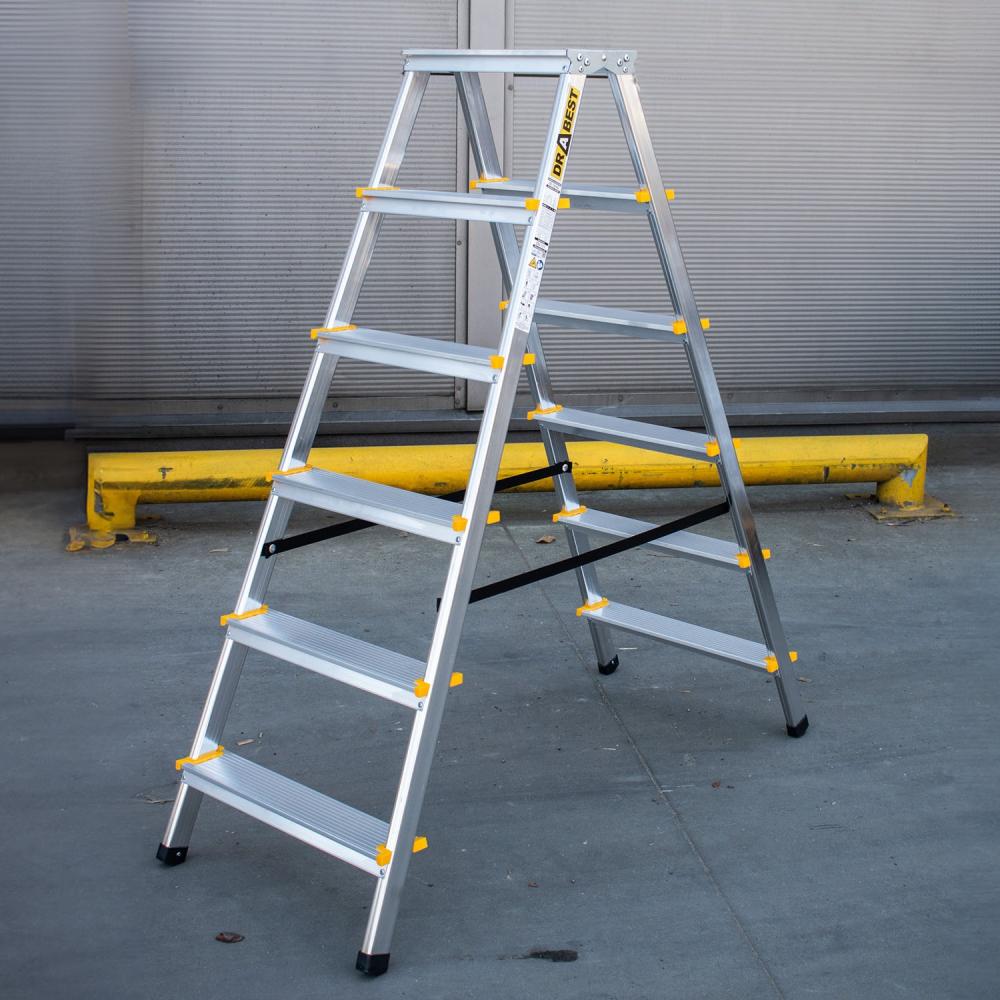 Aluminijske samostojeće ljestve s obostranim pristupom kompaktnih su dimenzija i vrlo praktične za korištenje i skladištenje. Zbog nosivosti od čak 150 kg, osim za kućnu, mogu biti i za profesionalnu uporabu. Širina gazišta od 80 mm omogućuje duže stajanje na ljestvama bez umaranja, a platforma je dizajnirana tako da se na ljestvama može i sjediti prilikom obavljanja nekog posla. Platforma i gazište su osigurani od klizanja, a stope protiv proklizavanja i prevrtanja.